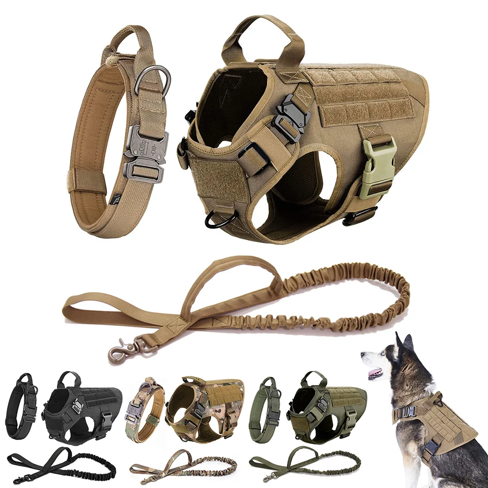 A full tactical dog harness collar leash set including: 1 military dog vest harness + 1 tactical training dog collar with quick release buckle + 1 adjustable bungee training dog leash